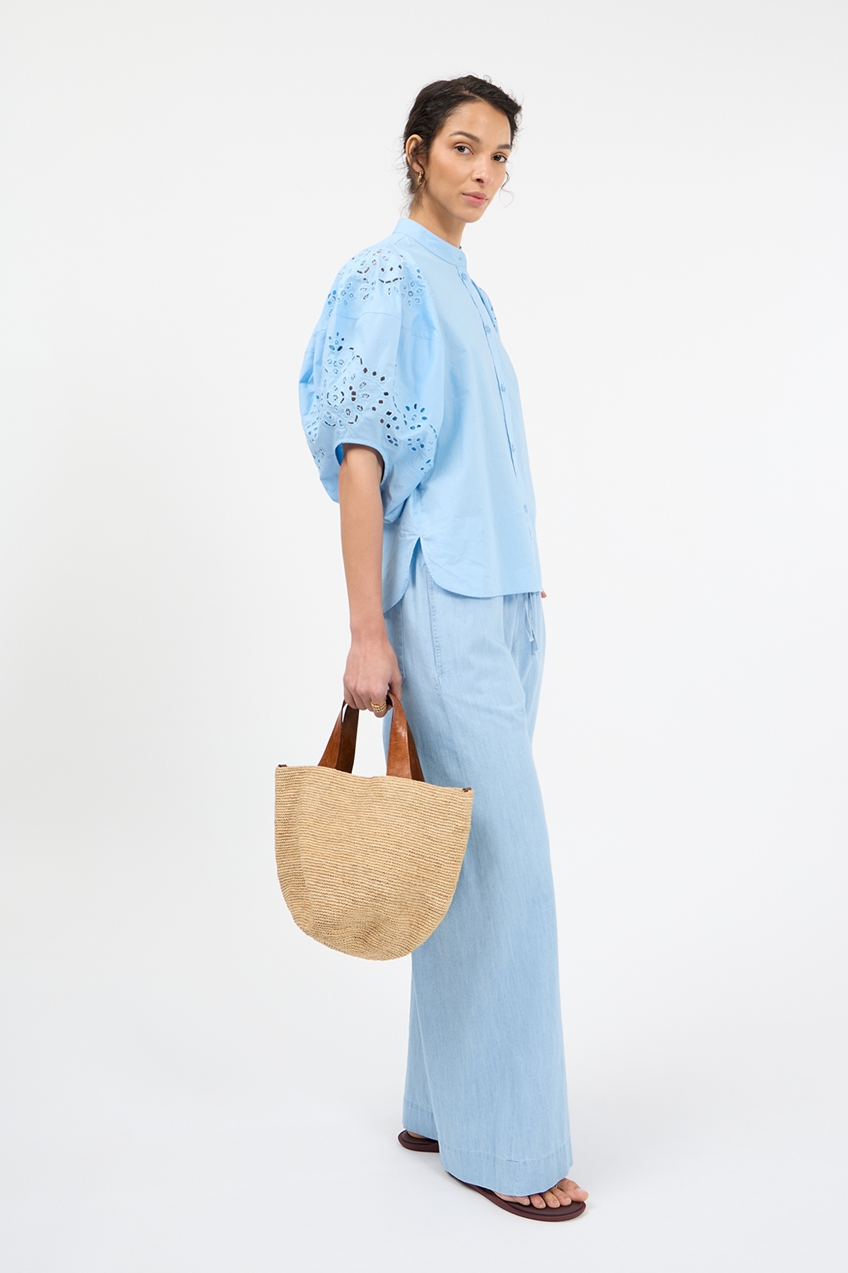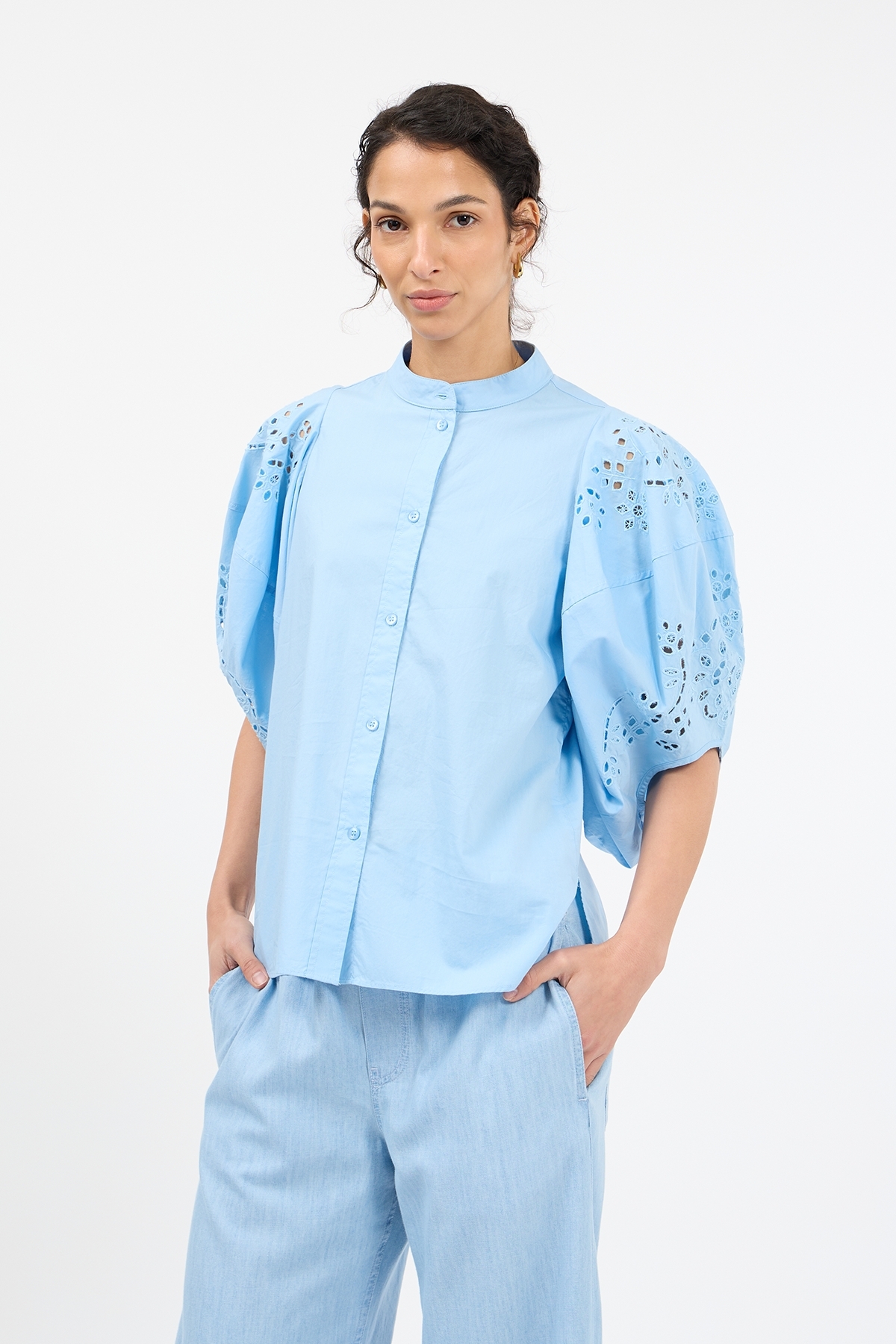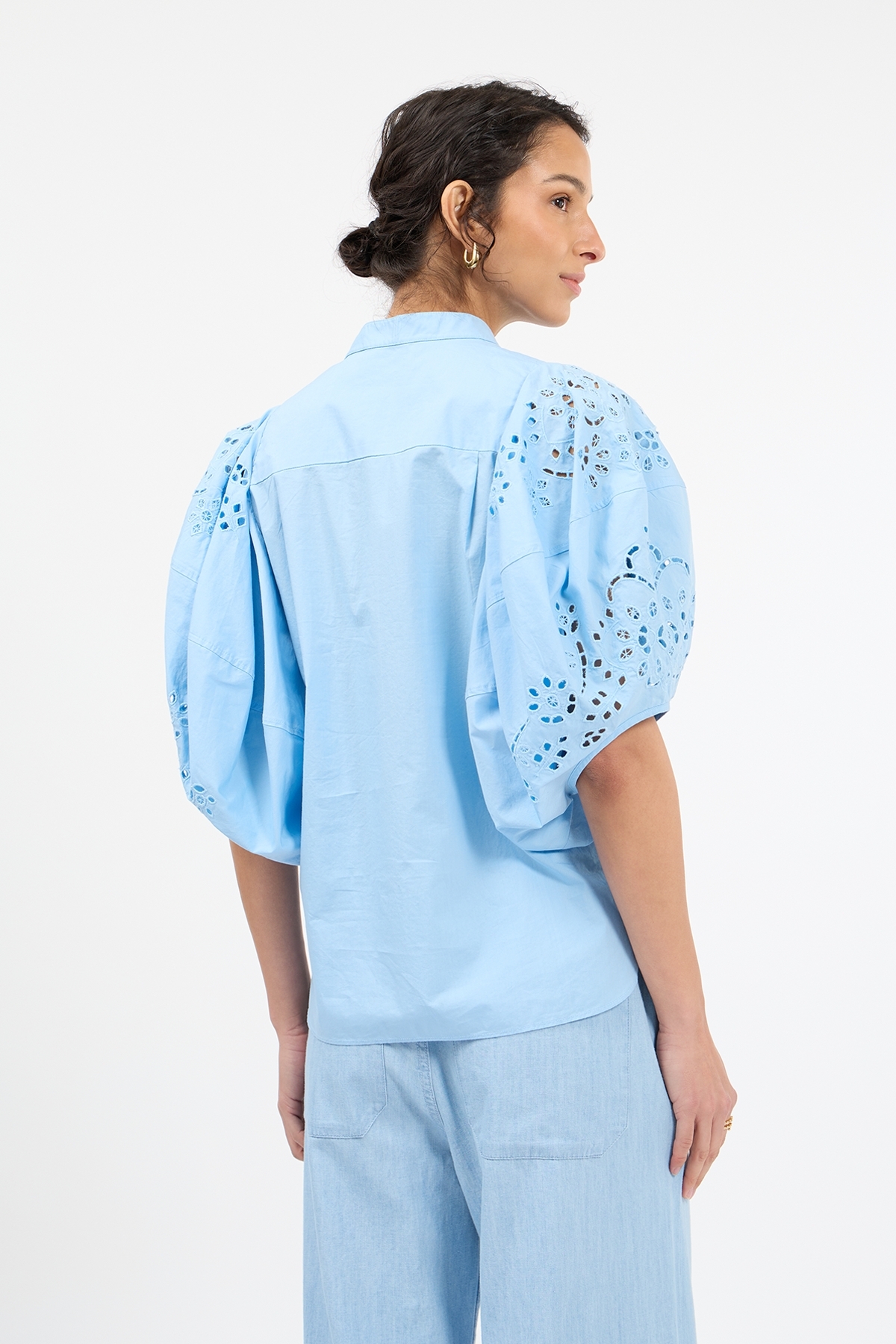 • Halblange Ballonärmel mit Broderie Anglaise