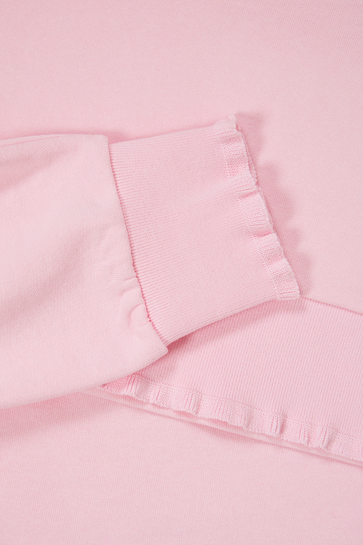 • Geripptes und gerüschtes Bündchen an Ärmel und rückseitigem Saum